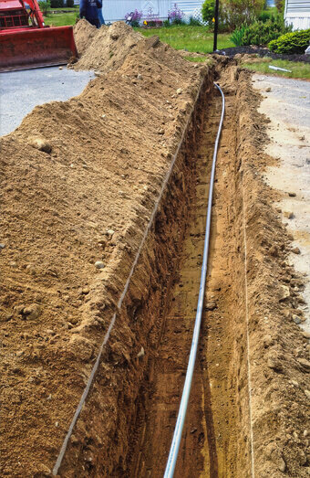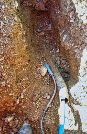 Expert installation of underground consumer mains using high-quality XLPE or SDI cables in heavy-duty conduit with appropriate warning tape for maximum protection.